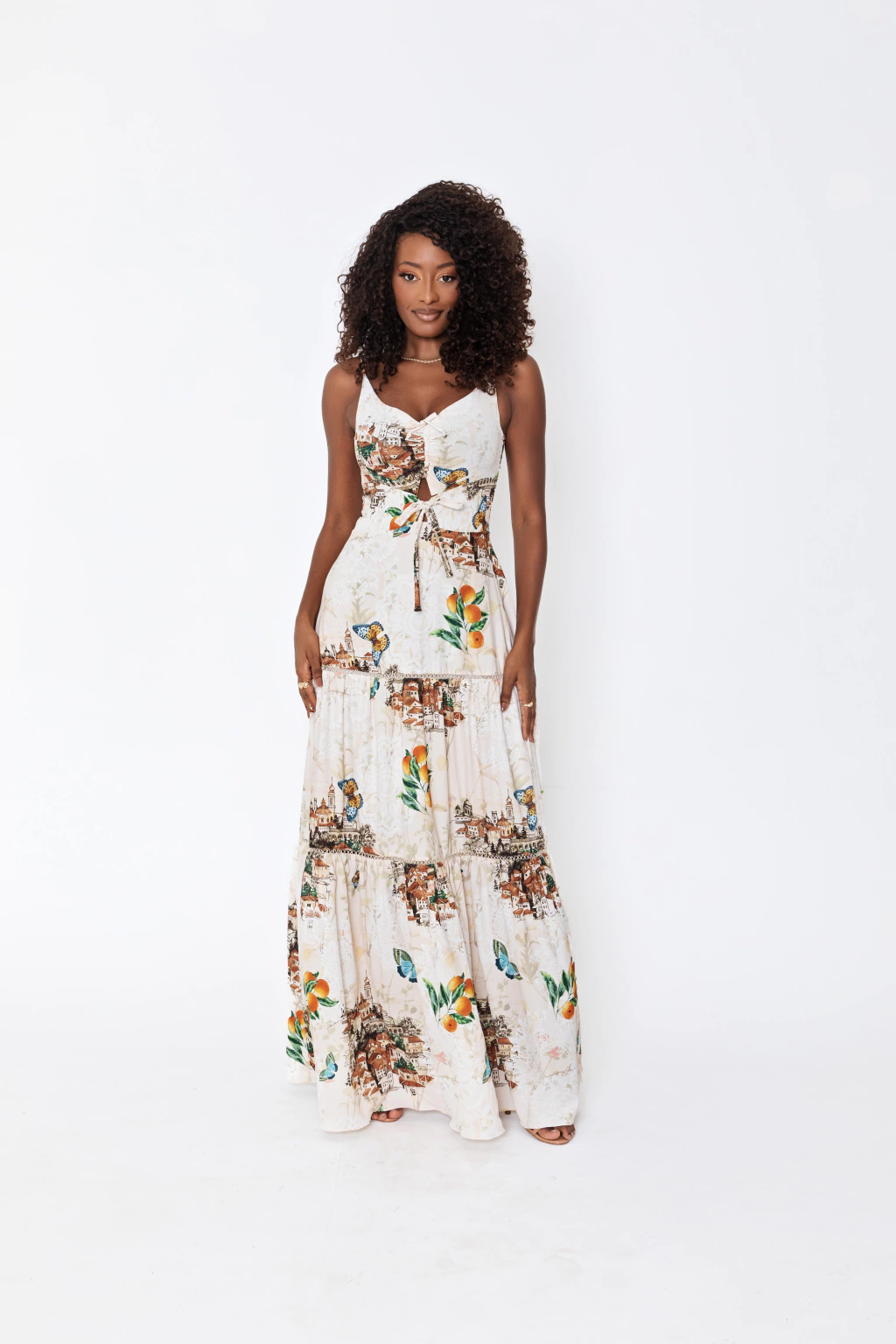 A estampa Jardim das Borboletas retrata pequenas casinhas pitorescas, com detalhes de borboletas e frutos.