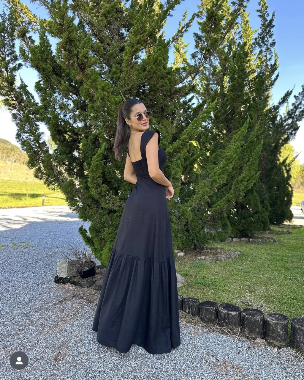 Com um corte clássico e feminino, o vestido longo destaca sua silhueta de maneira elegante e sofisticada. Alças mais largas e altas deixam a peça muito empoderada. Detalhe de fenda na saia.